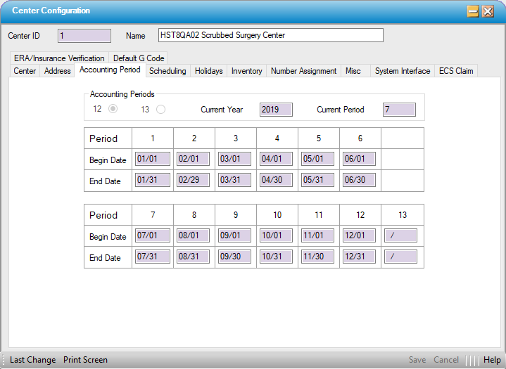The beginning and ending dates of each accounting period are defined in Administration > Center Configuration > Accounting Period tab.