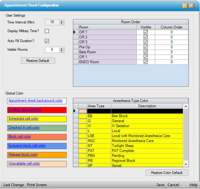 To open the Color selection window for Anesthesia Type Colors, click on the grey box to the left of the Anes Type. The selected Anesthesia Type colors will display on the Appointment Sheet until the appointment is checked in, at which time the "Checked In cell color" will display.