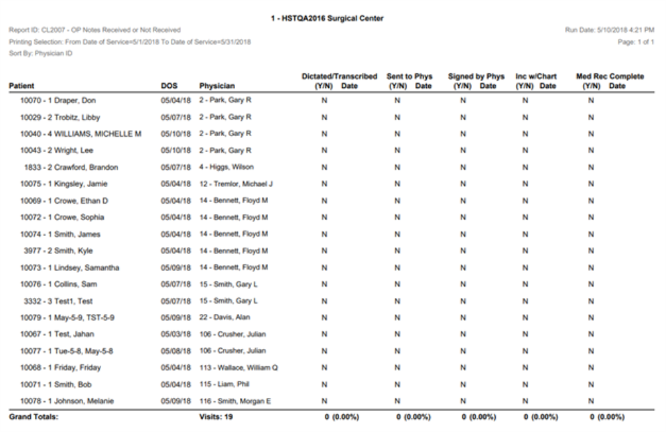This report will print overall status of physician operative notes from transcription to final signed receipt from physician and logging into medical record. Report will pull status and date received for transcription, sent to physician, signed by physician, received into chart and medical record complete. Dates of each event can be recorded.