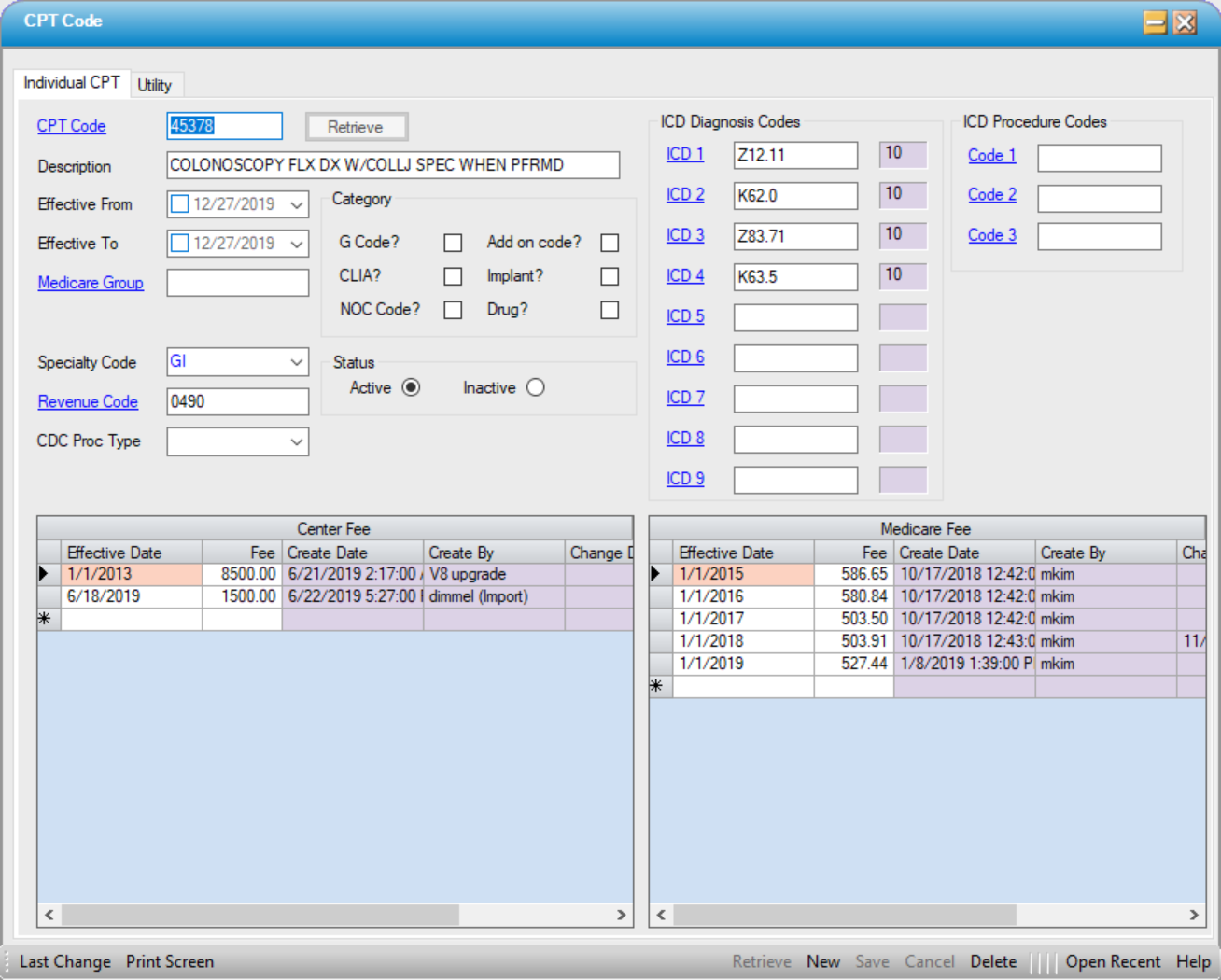 NOTE: Both the Center Fee and the Medicare Fee can be entered and/or updated utilizing the Utility > Data Import function.