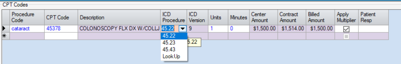 - If centers have insurance contracts that still require ICD Procedure Codes, the three most common ICD Procedure Codes can also be mapped to the CPT Code. The first code entered will default in Charge Entry. The additional codes will be available from the drop down. (If a code is required that was not entered here, select LookUp to find the correct code.)