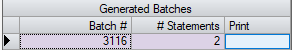 - The Generated Batches grid will display the Batch #, the # of Statements in the Batch, and a Print function when New Batches are generated.