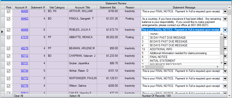 - The Reason column reflects the reason that the current statement was created. Posting would refer to triggers set in Statement Options where either Insurance Payment or Self-Pay Payment will trigger a statement. Inactivity would indicate that none of the triggers have been met within the 28 day patient statement cycle. (In other words, the patient is simply due for another statement.)