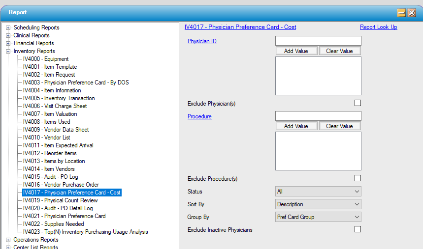 • Select by surgery Physician ID(s), Procedure(s) and status of the card.