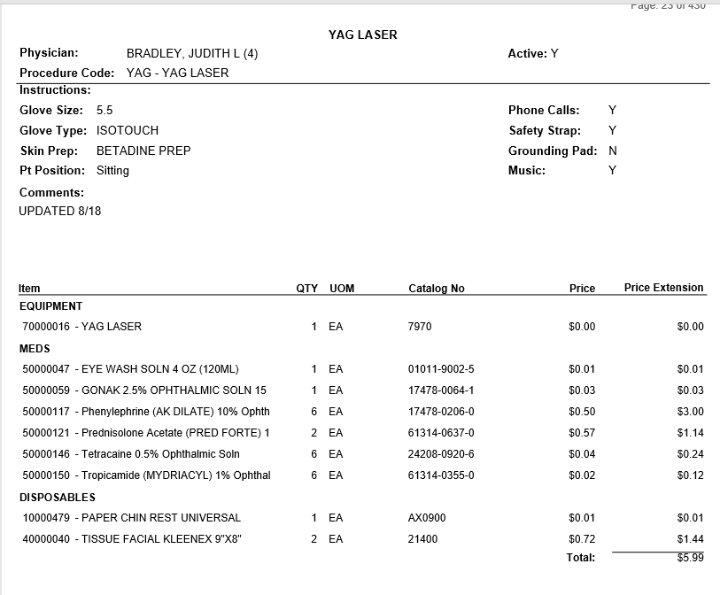 Detailed preference card information which includes costs for the items entered on the Physician Preference Card.  Prints a new page for each Preference Card if multiple cards selected.