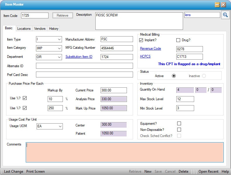 Enter a Revenue Code or select the hyperlink to search. The Revenue Code must be entered to flag this item as billable so that it appears on the Load Inventory form in Charge Entry.
