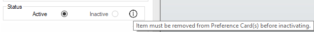 Active and Inactive radio dials are available for items that are no longer in use but cannot be deleted because they have been entered on a case. Items cannot be inactivated, however, if they exist on a preference card, are used in eChart, or have been categorized as equipment. The Inactive radio dial will be disabled, and an
