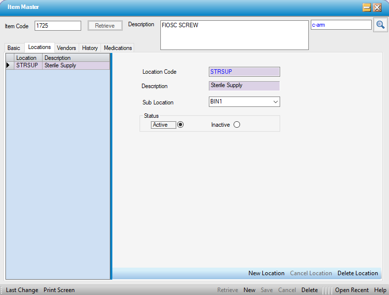 The Locations tab indicates where the Item is located, both for ease of pulling items for a case and performing Physical Counts. It provides both a Location, which is the room or department in which the Item is located, as well as a Sub Location, which may be the shelf, drawer, or bin in which it is stored.
