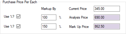 NOTE: The system assumes the cost at 100%, so if the desired mark-up is 250%, enter 150 in the Mark Up By field to calculate a total price of 250% of cost.