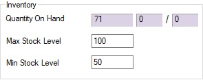 Minimum and Maximum stock levels can be entered here. The minimum and maximum levels will be based on the usage unit of measure, which is typically each.