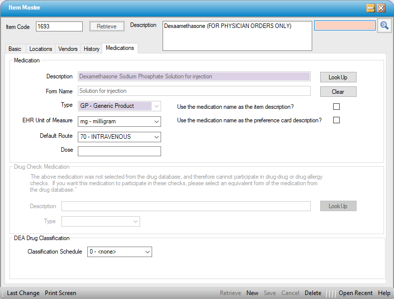 Check the Implant? or Drug? checkbox to indicate whether the item is an implant or drug.