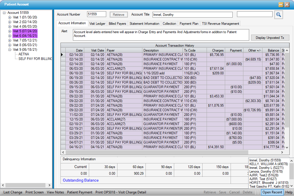 The Tree View on the left displays all visits associated with an Account. Visits may be color coded to indicate cancellation or collection status (hover messages will indicate status as well):