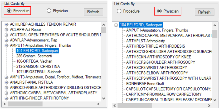 hyperlink. - Cards can be listed by Procedure or Physician: