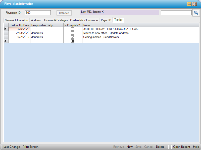 The Tickler is mainly used as a place to record miscellaneous provider information. It does not map to any reports. Centers may utilize for tracking credentialing information or for more personal information, as seen in the example below: