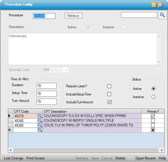 or select the magnifying glass to search by Description, Procedure, or Specialty Code. - The Description, Active/Inactive Status, and Specialty Code will appear as read only. In this set-up, these fields are maintained utilizing the Procedures menu selection.