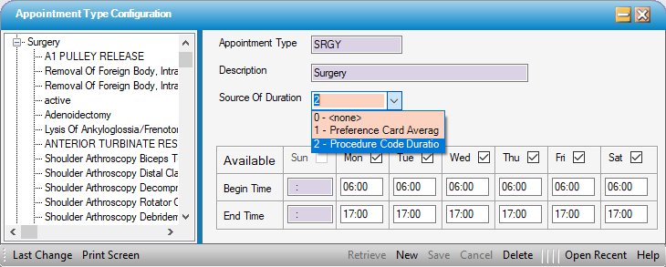 - If the Source of Duration in Scheduling > Appointment Type Configuration is set to 2 - Procedure Code Duration, then those times (in Minutes) are entered as Duration. Setup Time and Turn Around time can also be entered. If the box(s) are checked to include these times, then when a case is booked using the Procedure entered, the duration will include the time entered in each of these fields.