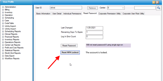 6. Click the Reset MFA Lockout button.