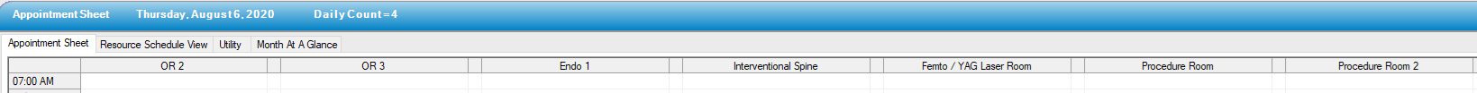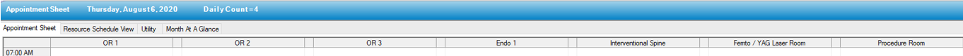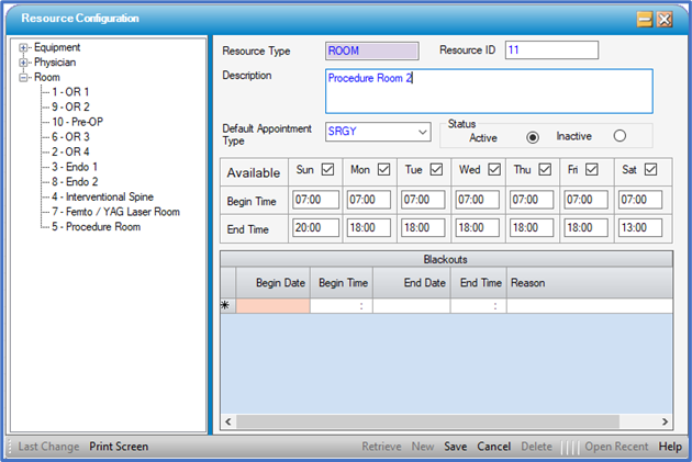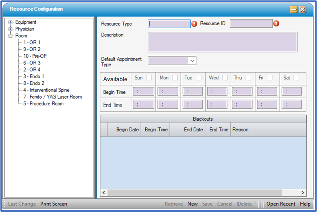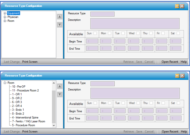 Note: Double clicking on any particular room, physician, or equipment, will open Resource Configuration.
