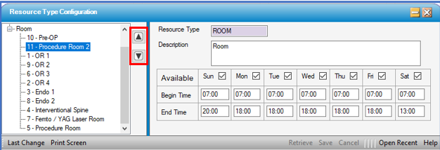 This is where the display order of the rooms on the Appointment Sheet can be changed. Open the tree structure for Rooms, click on a room, then click https://demo.hstpathways.com/HstAscWebServiceWCF/Help/image68.gif to move it up or https://demo.hstpathways.com/HstAscWebServiceWCF/Help/image69.gif for down The begin and end time of each room, physician, and equipment can also be edited.