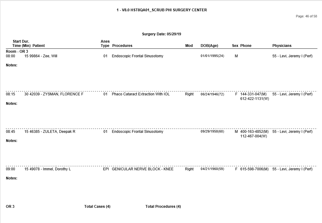 Tracks visit Appointments  within the specified schedule date range. Visit appointments are associated with appointment types defined in Appointment Type Configuration to require a patient visit (appointment type SRGY is the default). Includes Appointment Notes. A new page will print for each date of service selected; This report can be generated so each room is started on a new page – see Group option below.