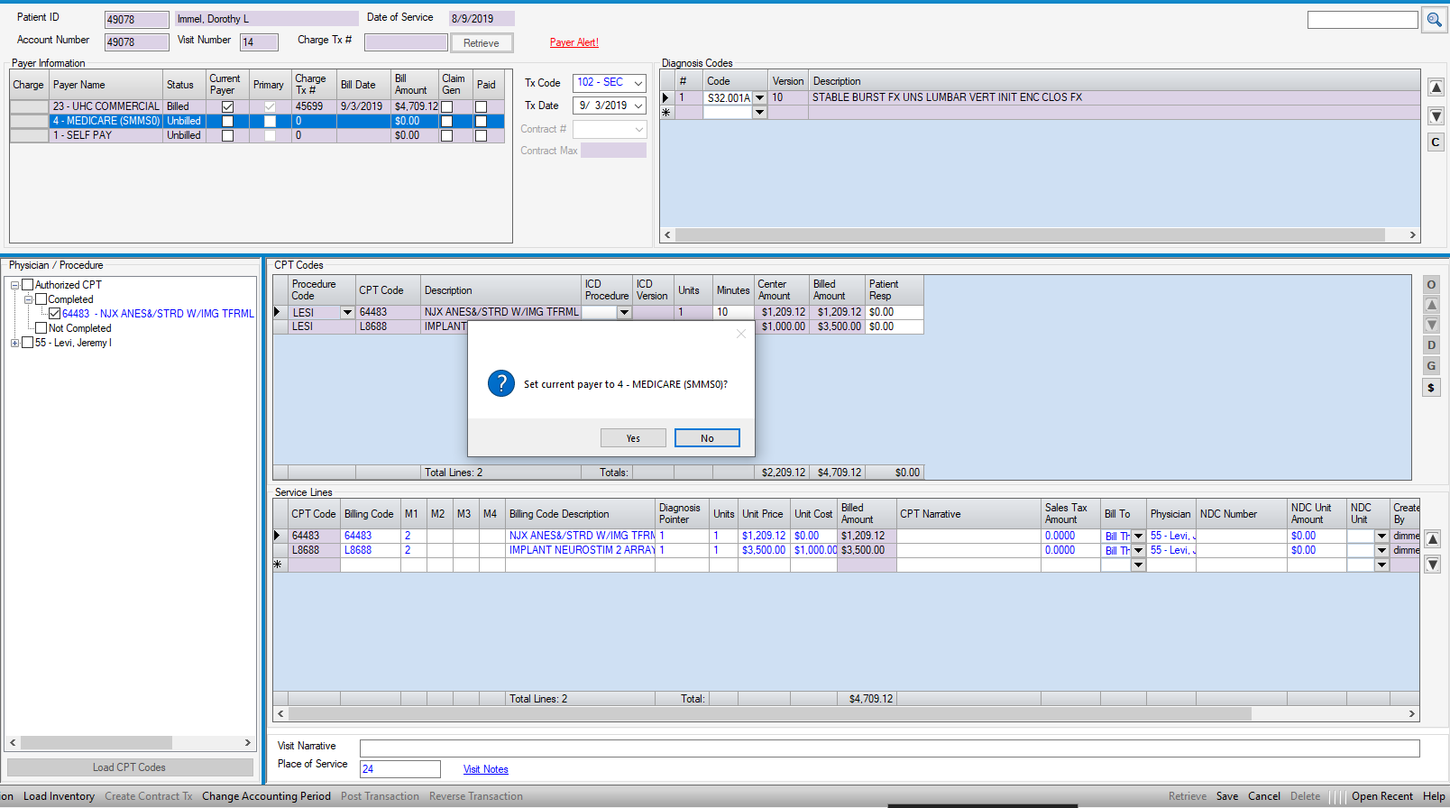 was selected, or if billing the secondary without posting a primary payment, retrieve the primary charge and double-click on the “Charge” cell in the Payer Information grid to the left of the insurance to be billed. This will put the form into ‘New’ mode and allow entry of diagnosis pointers or any other data that may be required to bill the secondary or subsequent payers. Once edits are completed and save selected, a pop up will ask whether to set the secondary as the current payer. To proceed, simply select yes.