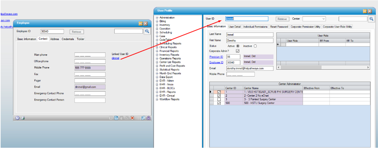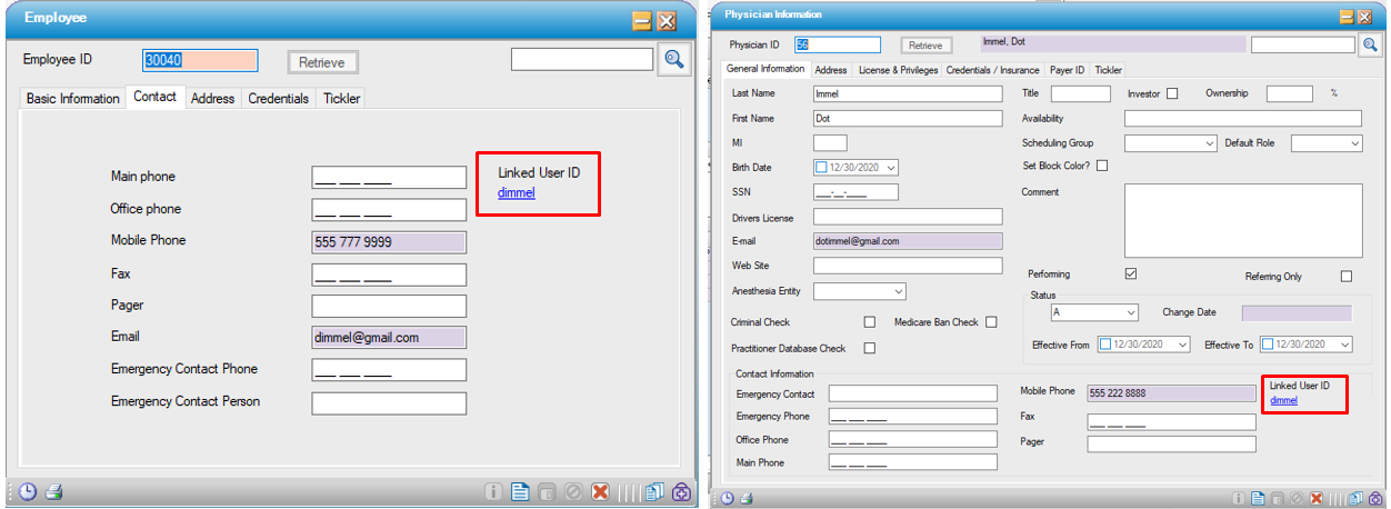 2. Click on the Linked User ID hyperlink to open the associated User Profile record. This action will leave the Physician/Employee open on screen.