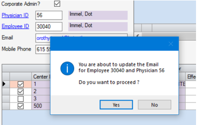 4. A message similar to the one below will display depending upon what data is updated (Email and/or Mobile Phone) and if the user has a linked Physician and/or Employee record.