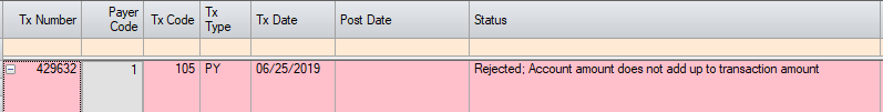 - Rejected transactions are pink, and the Status column will provide the reason for the rejection: