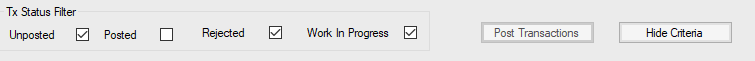 Tx Status Filter defaults to display Unposted, Rejected, and Work In Progress transactions. To see Posted transactions, manually check the Posted box.
