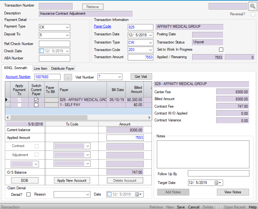 function key to enter the next Account Number, Visit, and Applied Amount. Status will be set to Work In Progress until total Applied Amounts = the Transaction Amount, at which time the transaction can be saved and posted. -